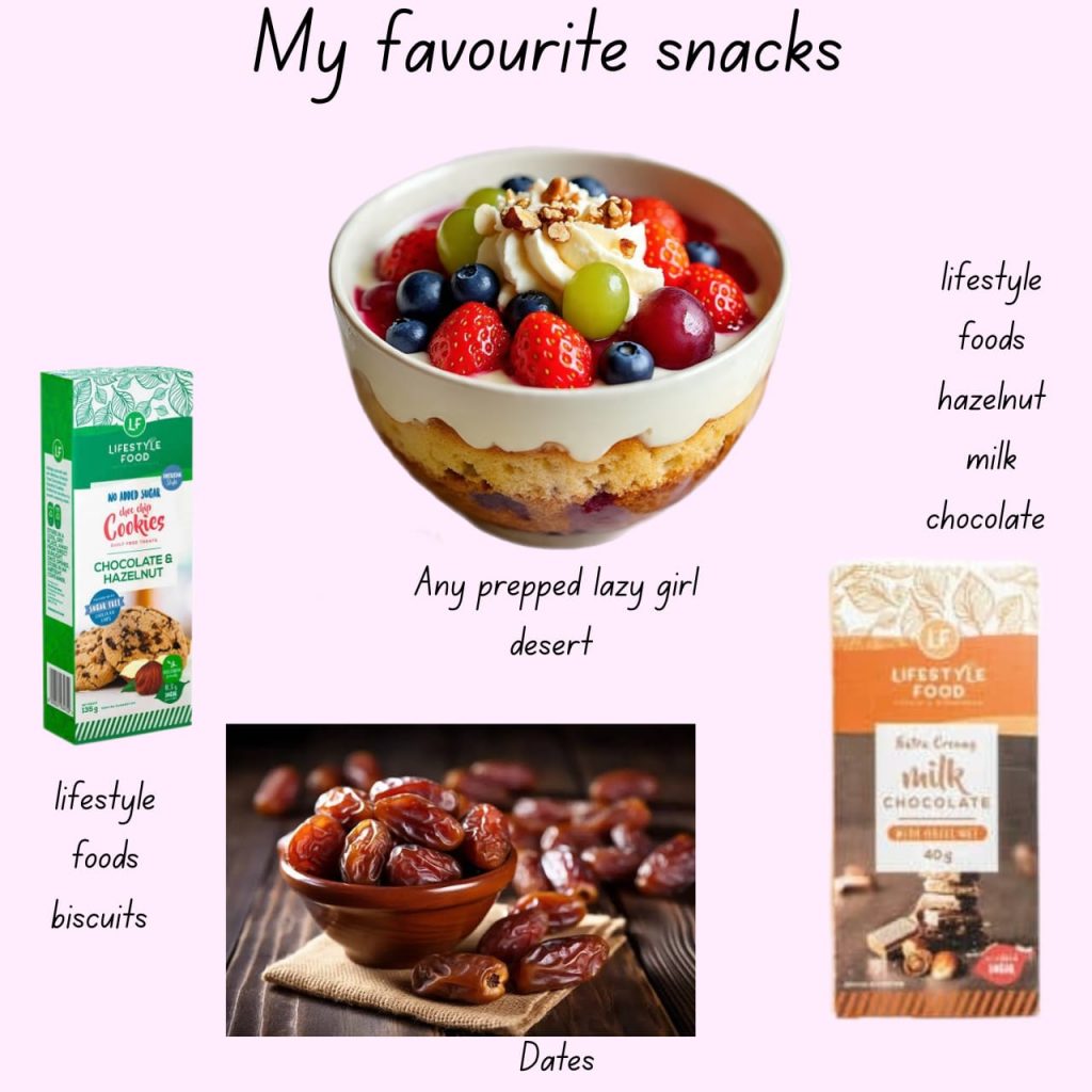 If you don’t plan snacks, you’ll grab whatever’s there—usually high sugar/fat. Prepping healthy snacks reduces impulsive eating by ~25%. My personal favorites are: Lifestyle Foods chocolate chip hazelnut cookies, dates, snack yogurt and literally whatever desert I made over the weekend. You can make Air-popped popcorn with seasonings (3 cups = ~100 calories). Experiment with different brands of low calorie and low sugar snacks my favorite’s brand is lifestyle foods but they are many different ones available.